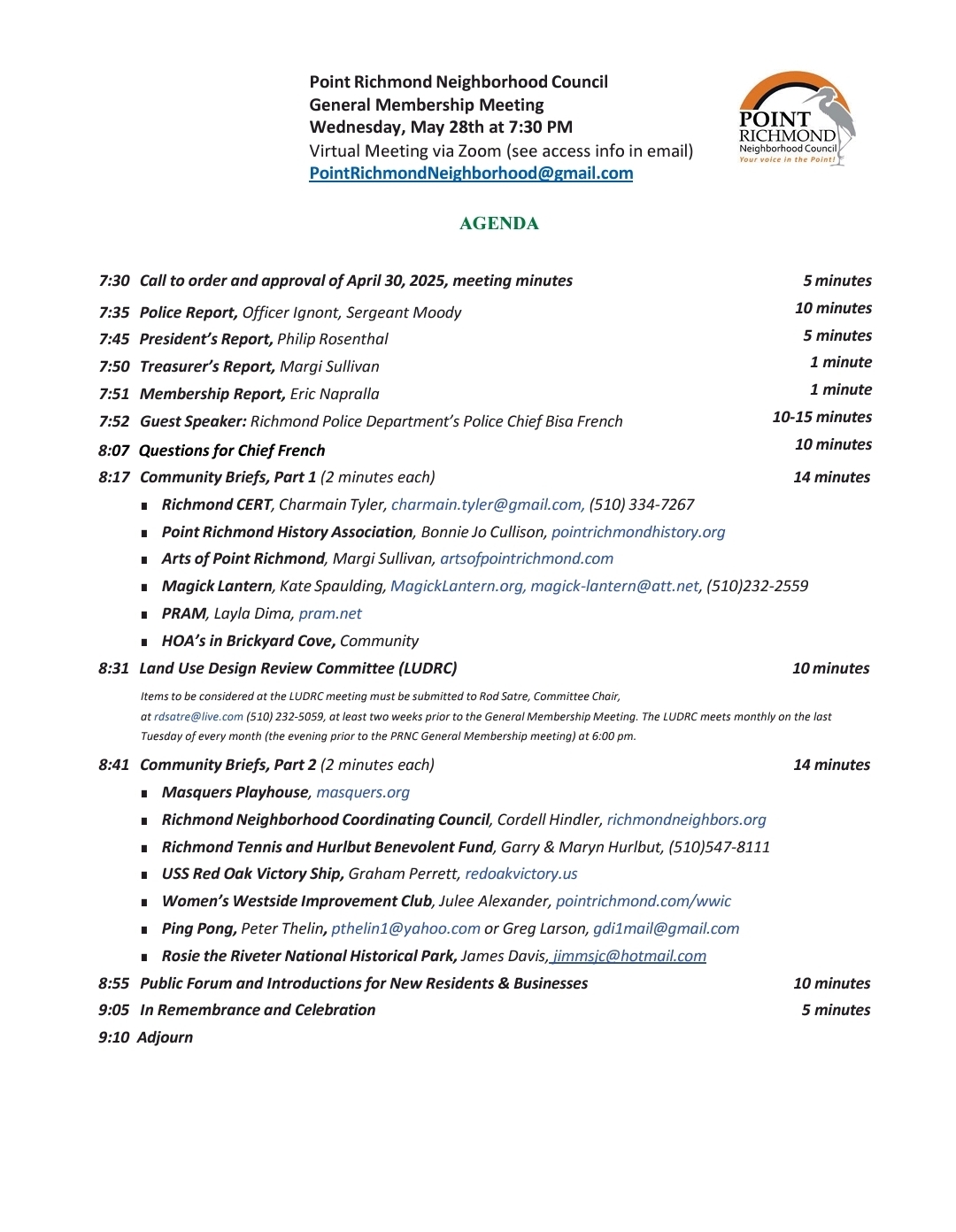 The next Point Richmond Neighborhood Council meeting is
